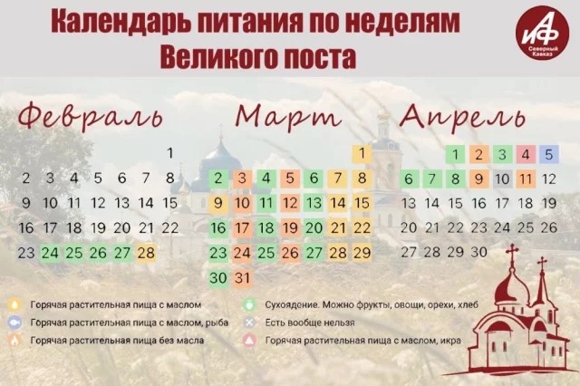 По церковному уставу в эти дни запрещены продукты животного происхождения: мясо, молоко, яйца, рыба (за исключением двух праздничных дней – Благовещения и Вербного воскресенья). В будние дни с понедельника по пятницу, если нет праздника, исключается и растительное масло. Среда и пятница – дни строгого сухоядения, когда разрешена только сырая пища без термической обработки. Однако церковь делает исключения для больных, пожилых людей, беременных женщин и тех, чья работа связана с тяжелым физическим трудом. Им разрешаются послабления.