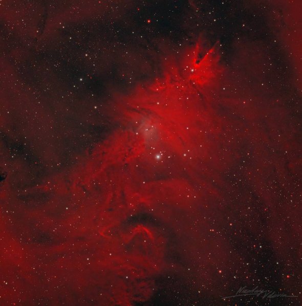 На изображении, полученном в созвездии Единорога, запечатлена область активного звездообразования. Яркие молодые звезды и светящиеся газопылевые облака формируют очертания, удивительно напоминающие силуэт новогоднего дерева со сверкающими гирляндами. Эта визуальная аналогия и подарила туманности ее праздничное имя.