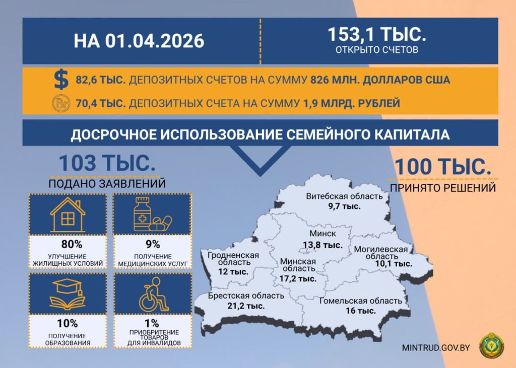 На 1 апреля 2026 года многодетные семьи Беларуси открыли 153,1 тысячи депозитных счетов «Семейный капитал», назначаемых при рождении третьего либо последующего ребенка. Об этом сообщили в Министерстве труда и социальной защиты.