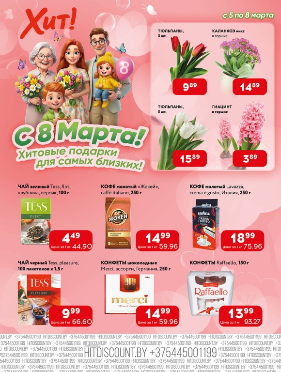 Главный женский праздник весны не за горами! Самое время придумать, как порадовать милых дам приятными сюрпризами. Чтобы не прогадать с подарками, предлагаем посетить магазин «Хит!», один из которых наверняка находится рядом с вашим домом. Здесь представлено все, без чего не обходится ни один женский праздник – цветы, конфеты, чай и кофе. А с 5 по 8 марта на целый перечень товаров действуют суперцены!