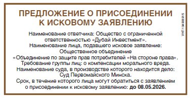 Инициатором выступило Общественное объединение «Объединение по защите прав потребителей «На стороне права», которое 8 апреля разместило в государственной газете «Звязда» официальное уведомление под названием «Предложение о присоединении к исковому заявлению». Иск будет рассматриваться в суде Первомайского района Минска. Требование группы лиц – о компенсации морального вреда.