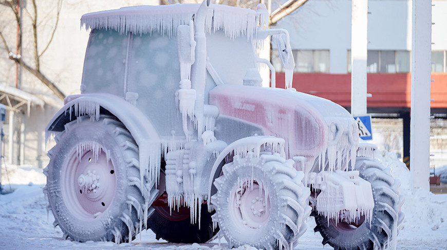 На Минском тракторном заводе провели необычное испытание, чтобы продемонстрировать надежность белорусской техники в экстремальных условиях. Работники облили холодной водой флагманскую модель трактора BELARUS 1222.3 и оставили его на морозе до полного обледенения.